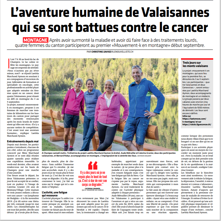 Six femmes atteintes de cancer vont participer à la 1ère édition de « mouvement-k en montagne » qui aura lieu du 3 au 5 septembre 2021. Le challenge de cette année est 3 jours de marche avec sac à dos dans les montagnes en Valais avec hébergement en cabane.